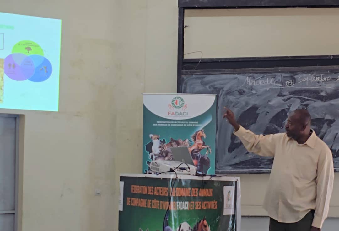 La formation des étudiants éducateurs canins de la Fédération des Acteurs du Domaine des Animaux de Compagnie de Côte d’Ivoire (FADACI) a pris une dimension particulière ce jour,avec l’intervention du Dr Kla Patrick, vice-président de l’Ordre National des Vétérinaires de Côte d’Ivoire.